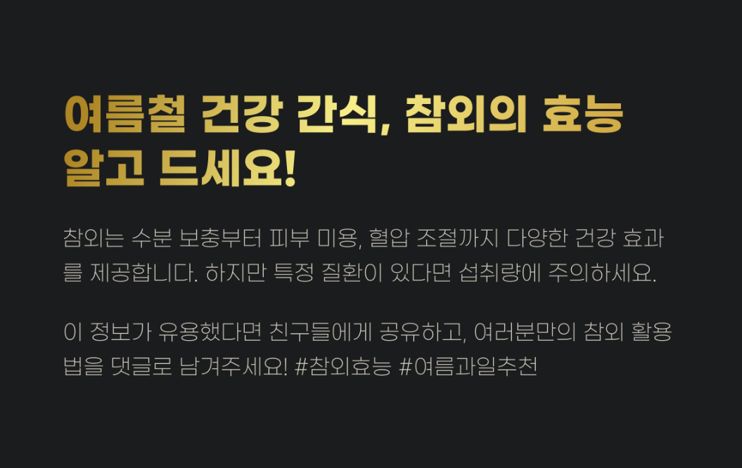 참외는 열량이 낮고 수분과 비타민이 풍부하여 여름철 수분 보충과 건강 유지에 탁월한 과일입니다