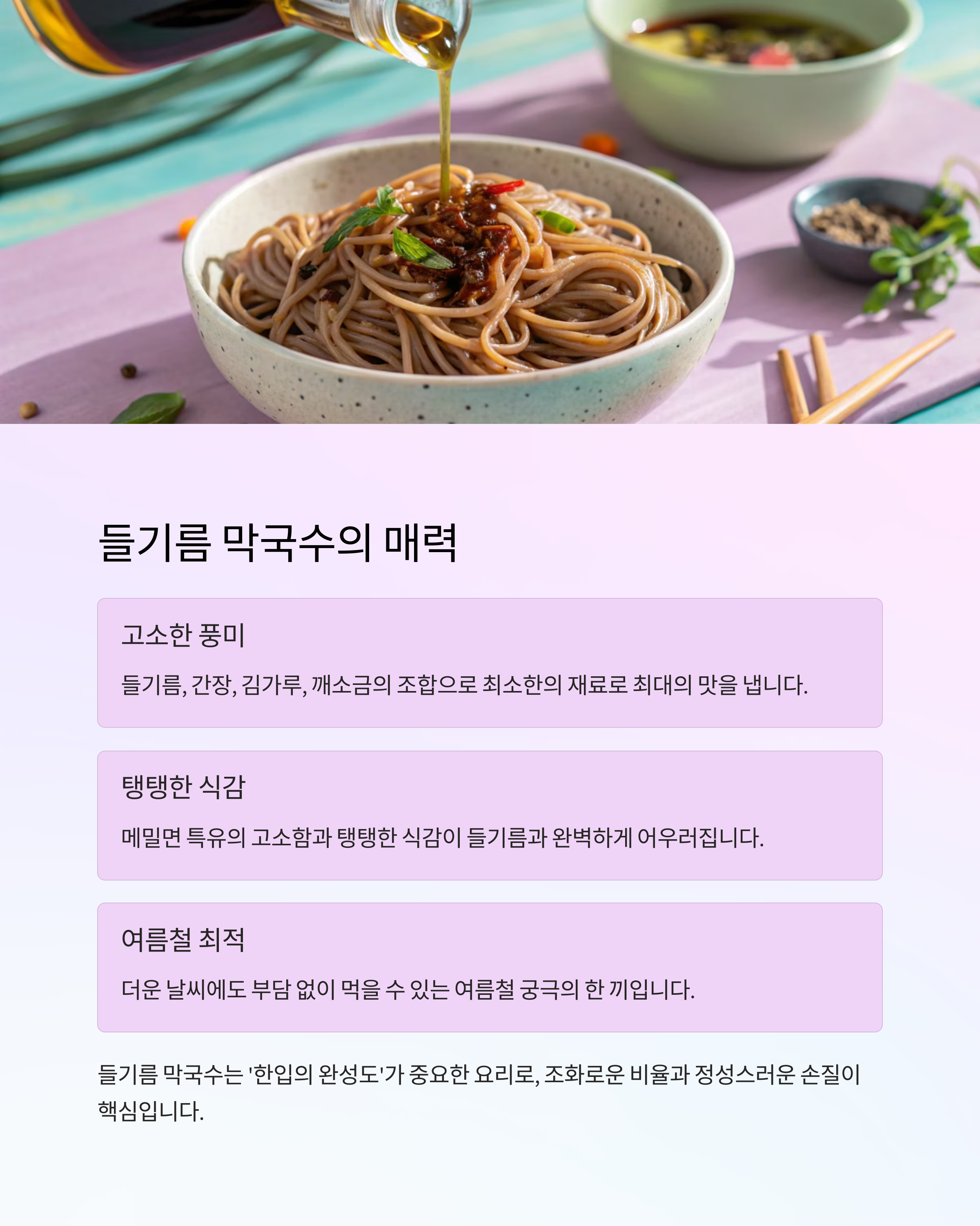 들기름 막국수는 단순하지만 풍부한 풍미,