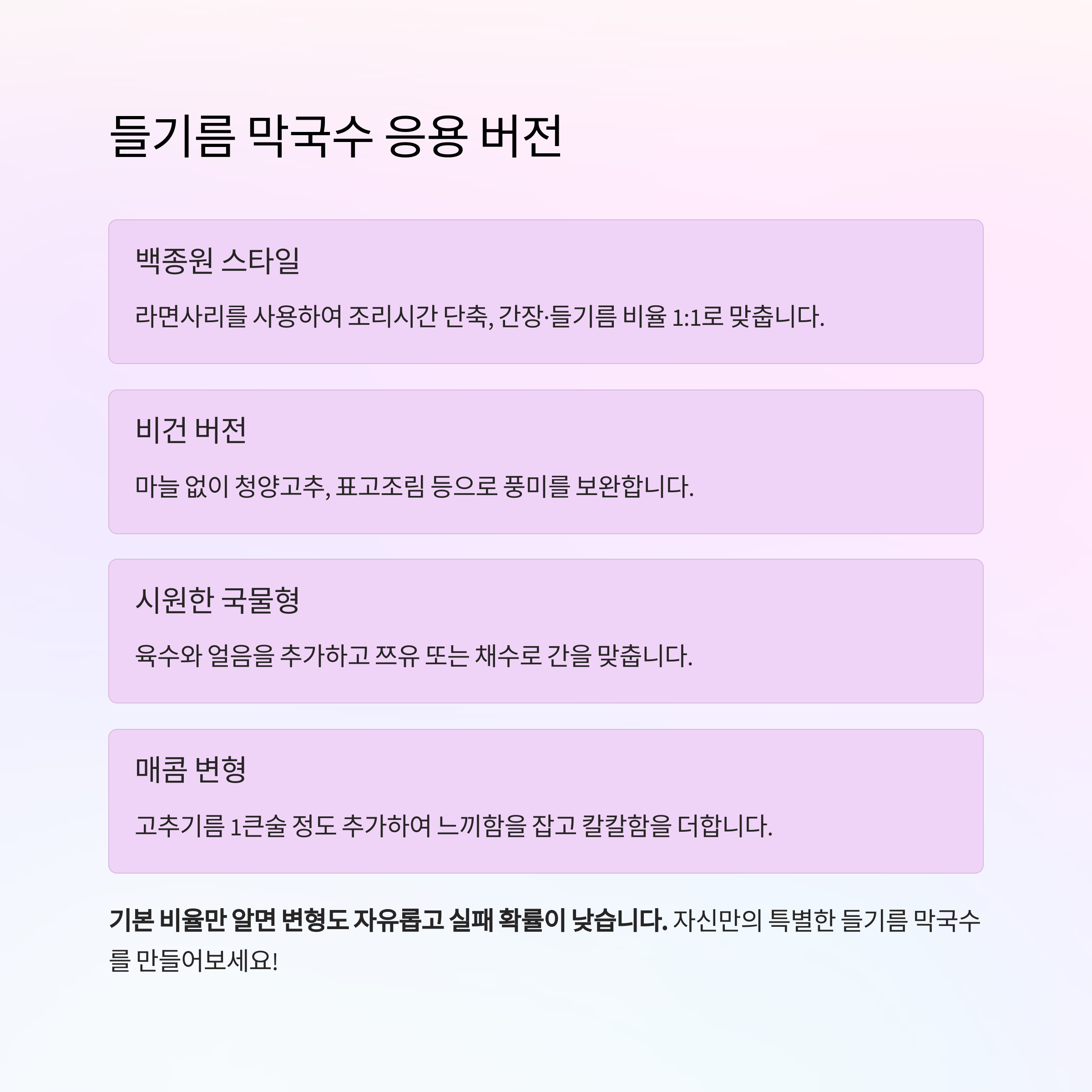 들기름 막국수는 다음과 같은 방식으로도 응용할 수 있습니다