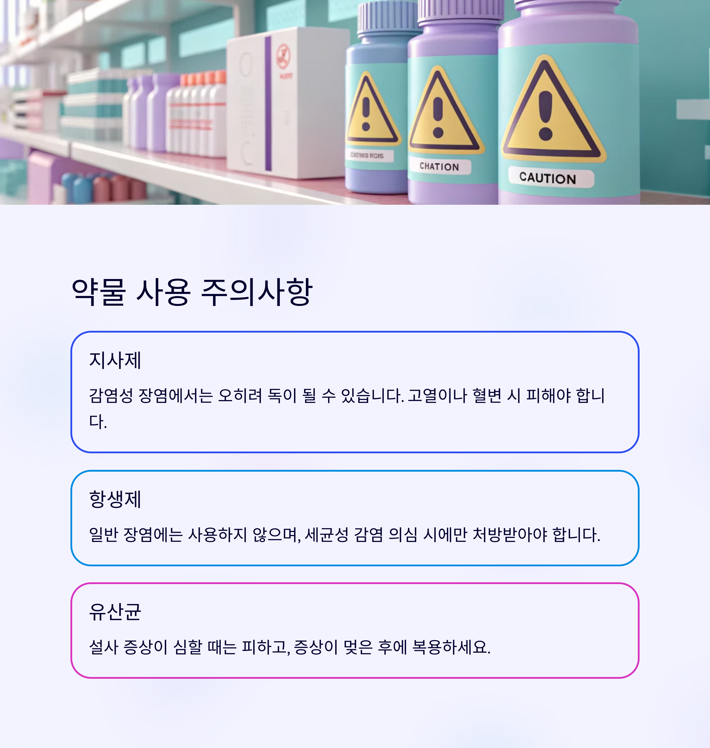 특히 고열이나 혈변이 동반된 경우, 세균을 장 안에 머무르게 해 회복을 지연시킬 수 있습니다.