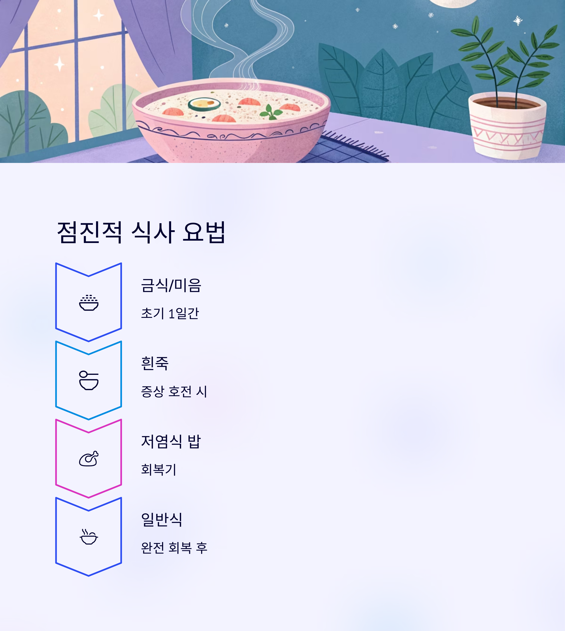 구토나 설사 증상이 호전되면 죽 → 저염식 밥 → 일반식 순서로 식단을 점차 확장합니다.