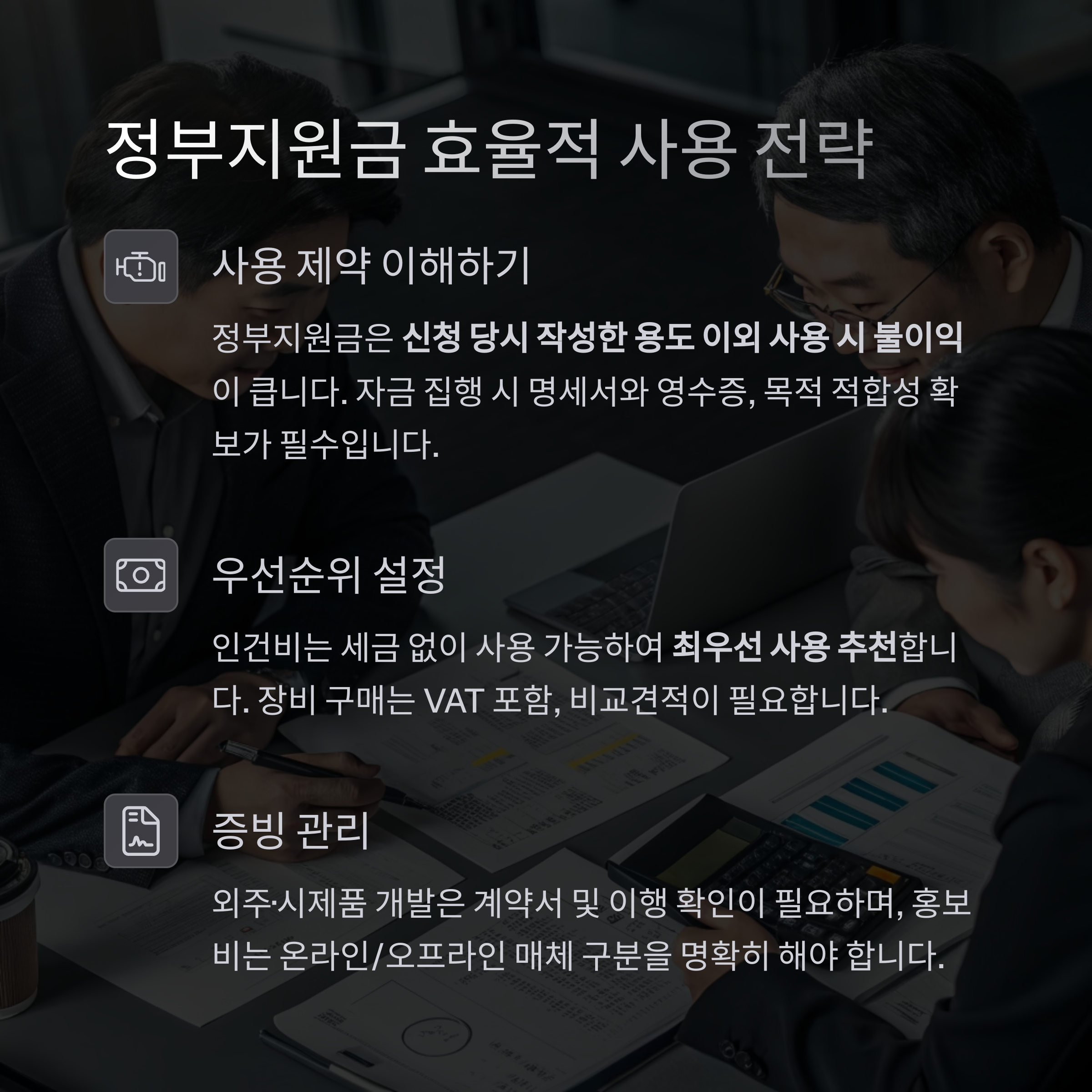 자금 집행 시 반드시 명세서와 영수증, 목적 적합성 확보가 중요합니다