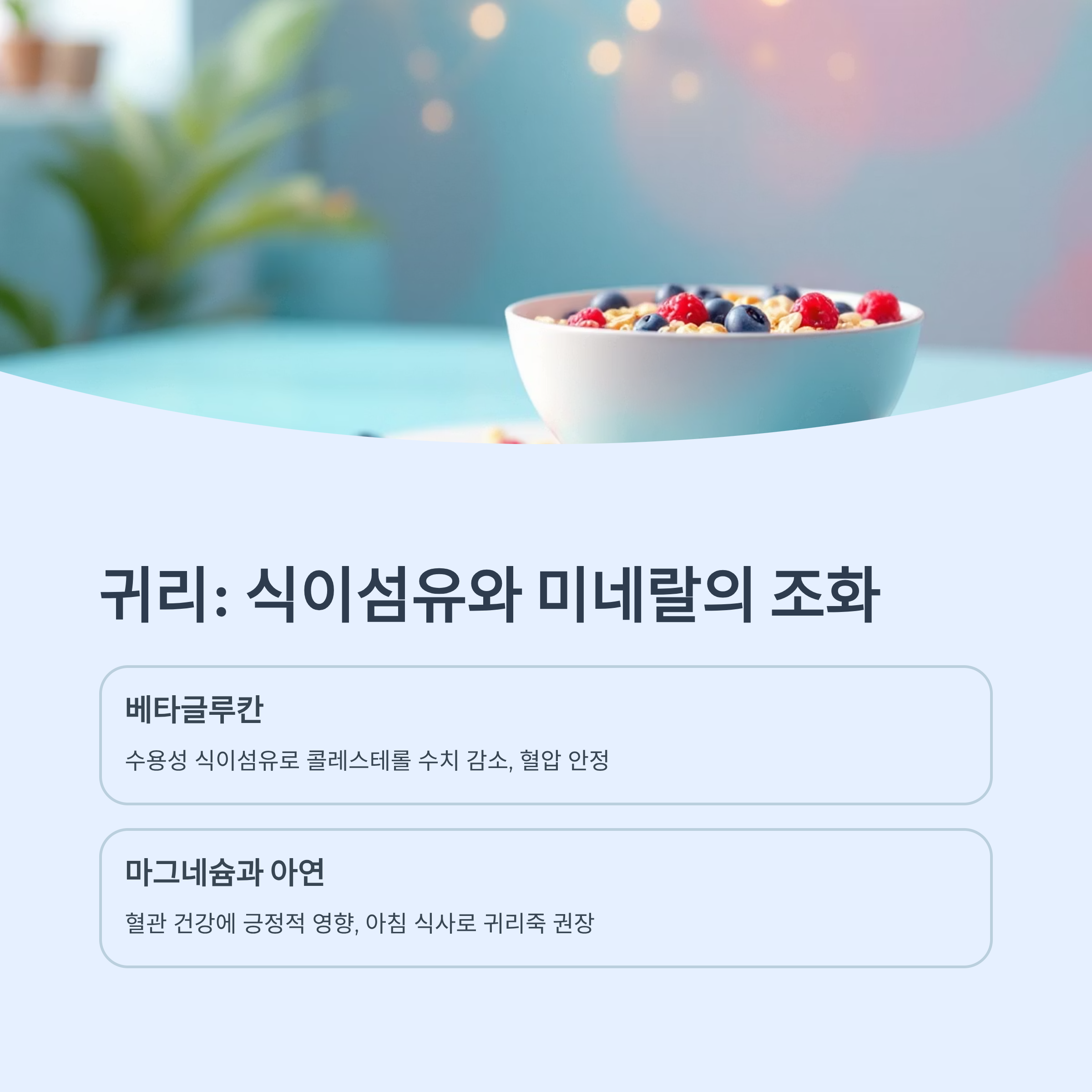 | 귀리 | 베타글루칸, 마그네슘 | 혈관 이완, 콜레스테롤 저하 |