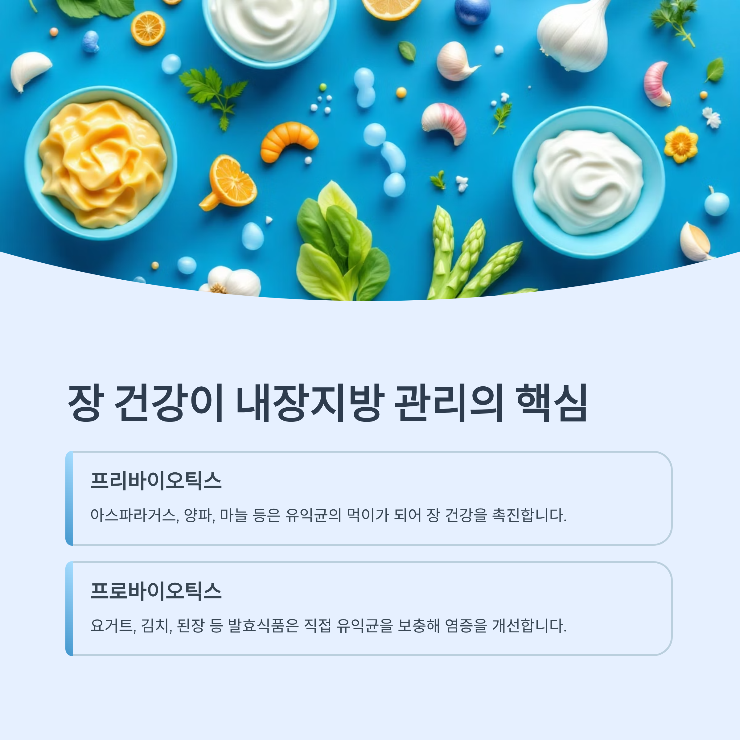보충해줍니다. 요거트, 김치, 된장 등 발효식품과 아스파라거스, 양파,