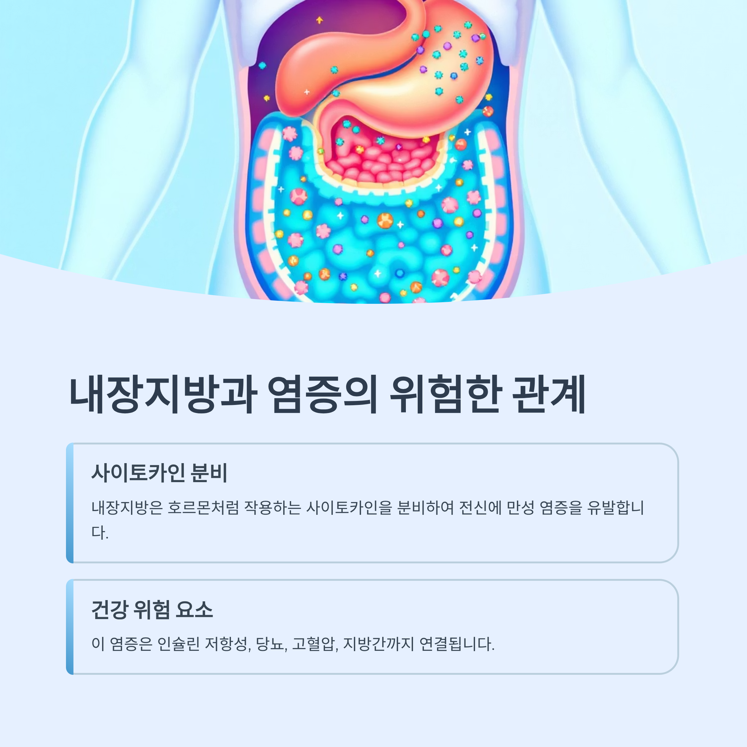 내장지방은 호르몬처럼 작용하는 사이토카인을 분비하며 전신에 만성 염증을 유발합니다.